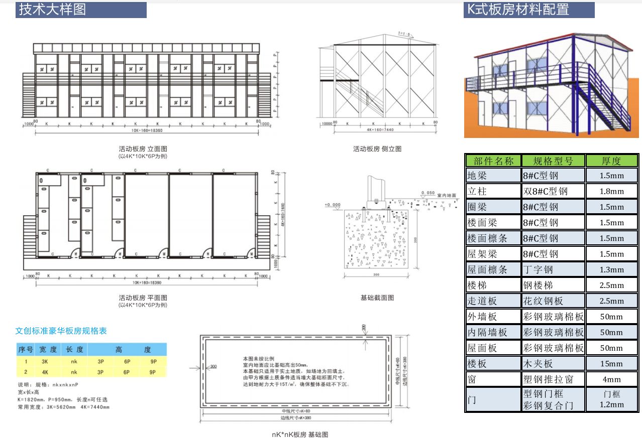 ·規(guī)格多樣:房屋采用標準化構件,長和寬均以K(1K=1820mm)為模數。房屋橫向尺寸mK+160,縱向尺寸為nk+160。