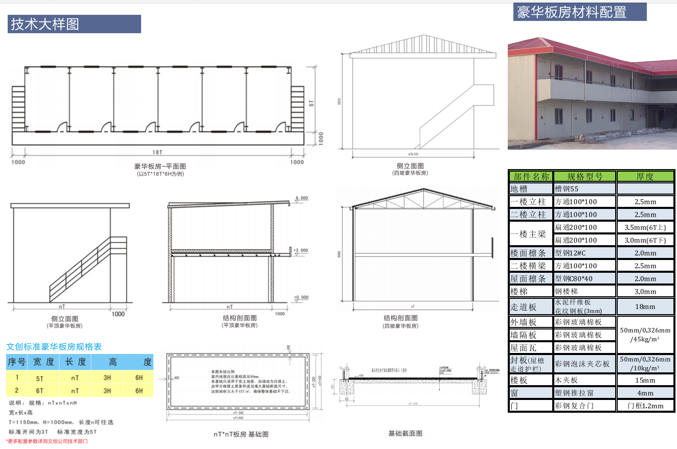 7、規(guī)格多樣。豪華活動板房采用標準化構(gòu)件,長和寬均以T(1K=1150mm)為模數(shù),高以P(1P=950mm)為模數(shù)。房屋橫向尺寸為mK+100,縱向尺寸為nK+100。